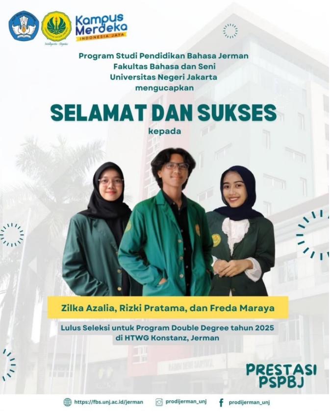 Prestasi membanggakan kembali ditorehkan oleh mahasiswa Program Studi Pendidikan Bahasa Jerman UNJ. Tiga mahasiswa/i angkatan 2022 — Zilka Azalia, Rizki Pratama, dan Freda Maraya — berhasil lolos seleksi Program Double Degree di Hochschule für Technik, Wirtschaft und Gestaltung (HTWG) Konstanz, salah satu kampus unggulan di Jerman yang dikenal sebagai negeri pelopor teknologi dan inovasi.