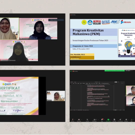 Tahun ini, Workshop PKM Pendidikan Bahasa Jerman dilaksanakan secara daring melalui Zoom Meeting pada 25 November 2023 dengan tema “Workshop PKM PBJ 2023: Menggali Potensi dan Membentuk Mahasiswa yang Kreatif.” BEMP PBJ menghadirkan narasumber dari luar prodi, yaitu Ibu Dra. Nursilah, M.Si., dosen Program Studi Pendidikan Tari sekaligus pembimbing PKM di prodi tersebut, untuk memberikan perspektif yang segar dan inspiratif.