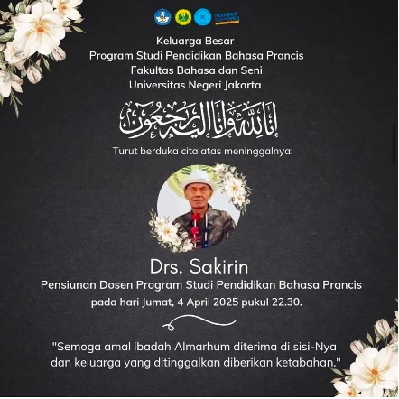 Pada Jumat, 4 April 2025, pukul 22.30 WIB, Pensiunan Dosen Program Studi Pendidikan Bahasa Prancis, Fakultas Bahasa dan Seni, Universitas Negeri Jakarta; Drs. Sakirin, telah berpulang ke Rahmatullah.