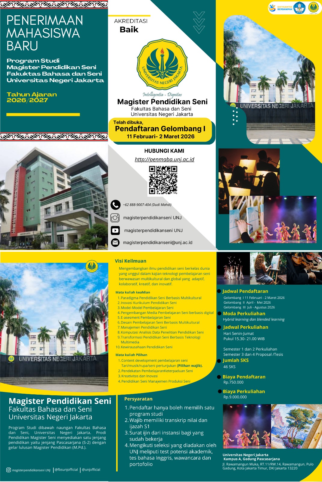 Program Studi Magister Pendidikan Seni Fakultas Bahasa dan Seni Universitas Negeri Jakarta (FBS UNJ) menawarkan kajian mendalam dalam bidang pendidikan seni yang mencakup berbagai aspek keilmuan. Mahasiswa di program studi ini akan mempelajari teknologi pembelajaran seni, manajemen pendidikan seni, penelitian pendidikan seni, serta pengembangan keilmuan seni dalam berbagai bidang seperti seni rupa, musik, tari, dan teater. Selain itu, program studi ini juga menekankan pada wawasan multikultural dan global dalam pendidikan seni, sehingga lulusannya diharapkan mampu mengembangkan strategi pembelajaran yang inovatif dan berbasis teknologi, mengelola institusi pendidikan seni secara profesional, serta melakukan penelitian yang berkontribusi terhadap perkembangan ilmu dan praktik pendidikan seni di tingkat nasional maupun internasional.